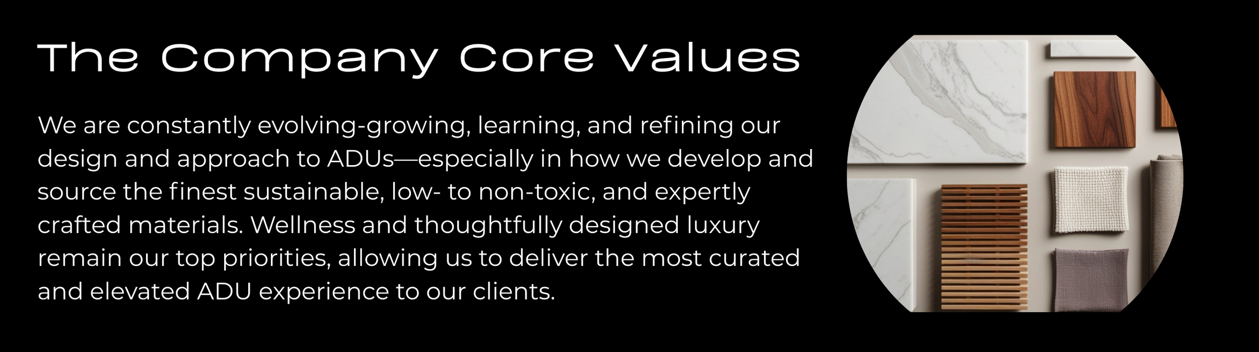 We design and deliver luxury ADUs with unparalleled craftsmanship, using low-to-non-toxic materials, factory precision manufacturing, and fully integrated custom interiors. Our design team harmonizes architecture, landscape, materials, and space planning—turning your dream into a healthy, sustainable, elevated reality.